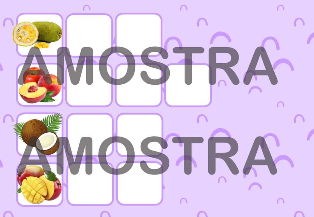 O Jogo Loto das Frutas é composto por 6 pranchas com as imagens das frutas e os espaços das sílabas para a escrita do nome das figuras. E também 6 folhas contendo as sílabas que deverão se recortadas.